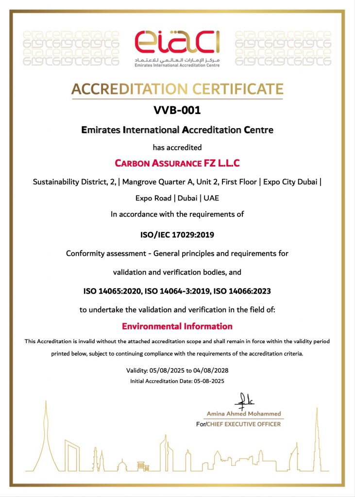 On August 5, 2025, Carbon Assurance was officially accredited by the Emirates International Accreditation Centre (EIAC), becoming the first Validation and Verification Body (VVB) in the UAE authorised to audit GHG emissions and reductions in compliance with international ISO standards.